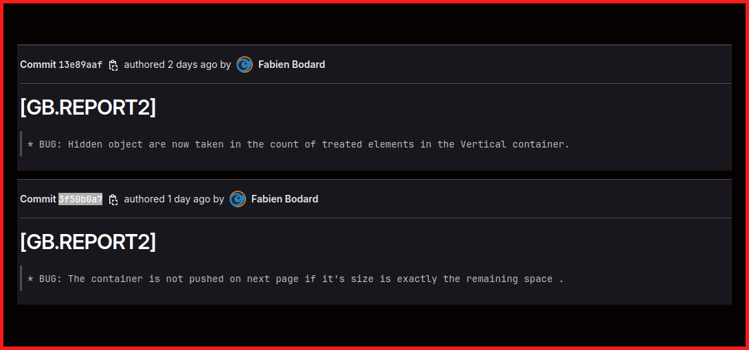 The fix was done in the gb.report2 ReportContainer.class. I compared the Gambas 3.19.6+bpo ReportContainer.class source with those from above commits to find what exactly was changed. Next, I replaced the 3.19.6+bpo ReportContainer.class with the changed ReportContainer.class from last commit mentioned above as it holds both fixes and started testing it all.