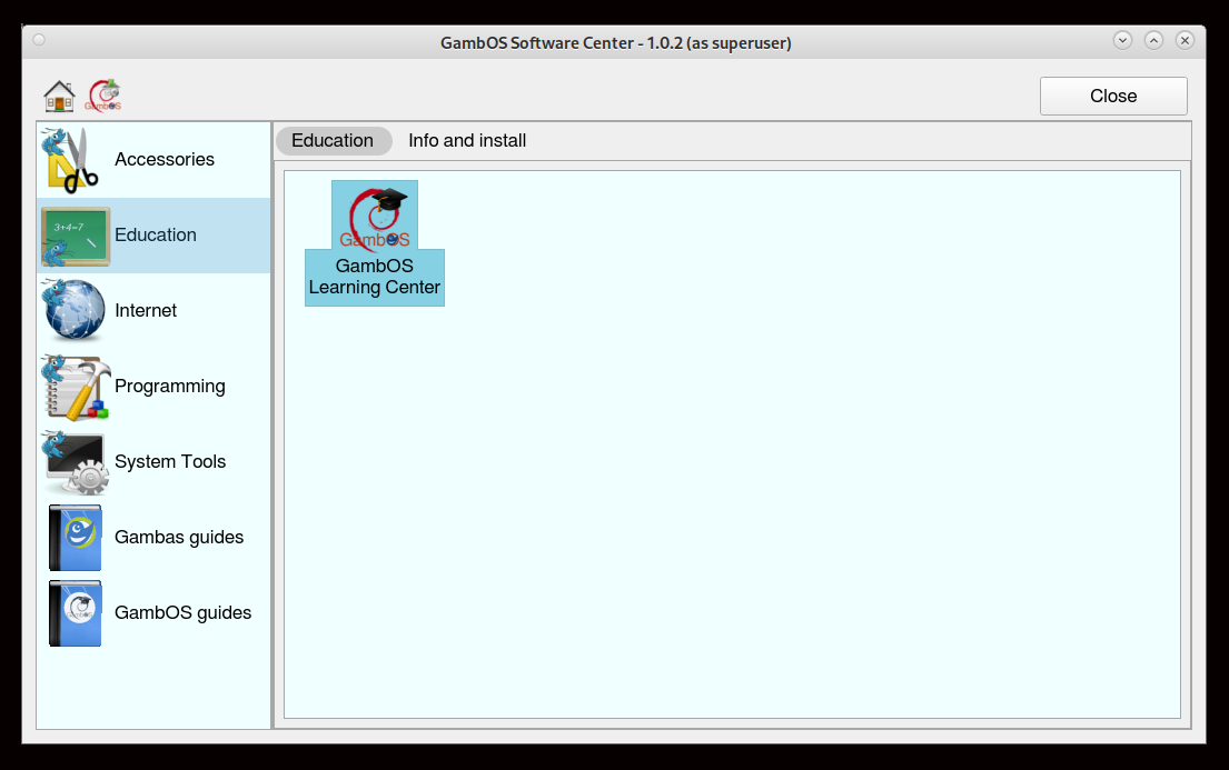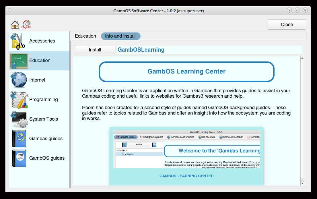 Clicking on GambOS Learning Center will show a tab with Info and Install options.