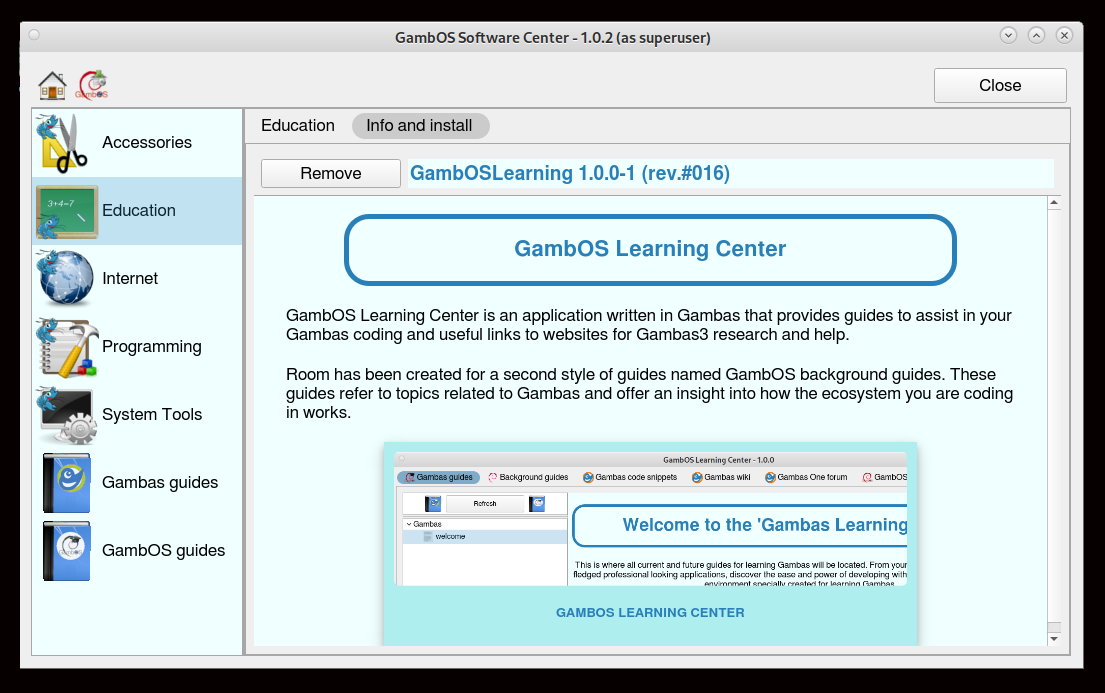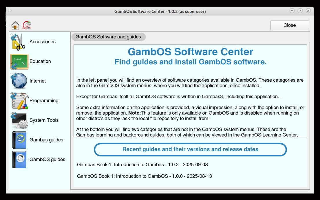 GambOS Software Center installs and removes guides and also checks for updated guides, to keep the guides up-to-date check 'Recent guides and their versions and release dates' on the front page of the GambOS Software Center for updates.